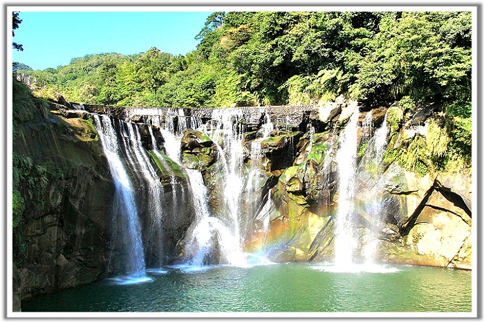 - 十分瀑布:十分瀑布位於台北縣平溪鄉,地處基隆河上游瀑布群,十分瀑布落差高度約20公尺,寬度約40公尺,壯麗的水瀑、磅礡的氣勢為台灣最大的簾幕式瀑布,而且瀑布下方水潭極深,水氣長年瀰漫不散,一經陽光折射,一道清麗的彩虹橫跨其上,故又有﹝彩虹淵﹞的美名!